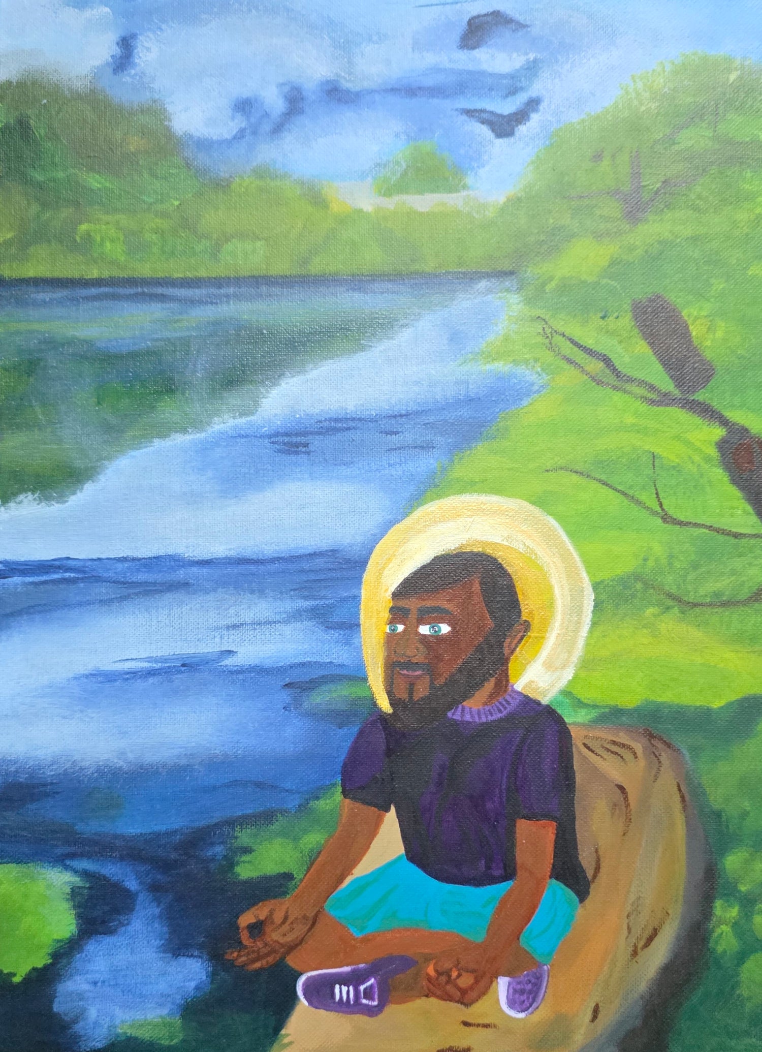 Man looks down river on the Huron sitting in mediation. Acrylic on Canvas.