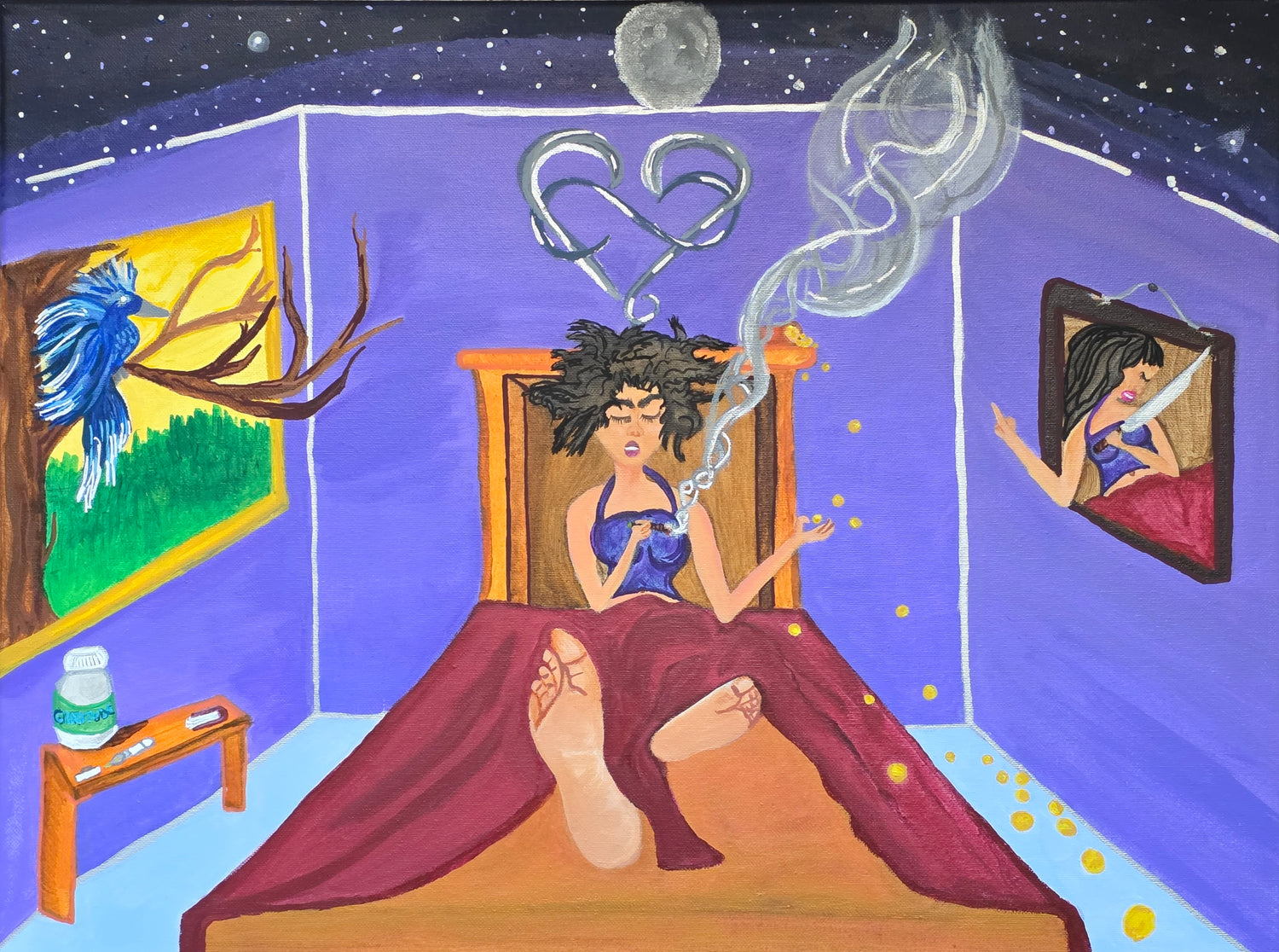 Woman lies in bed holding a doobie as other worlds reach into her room. Acrylic on canvas.