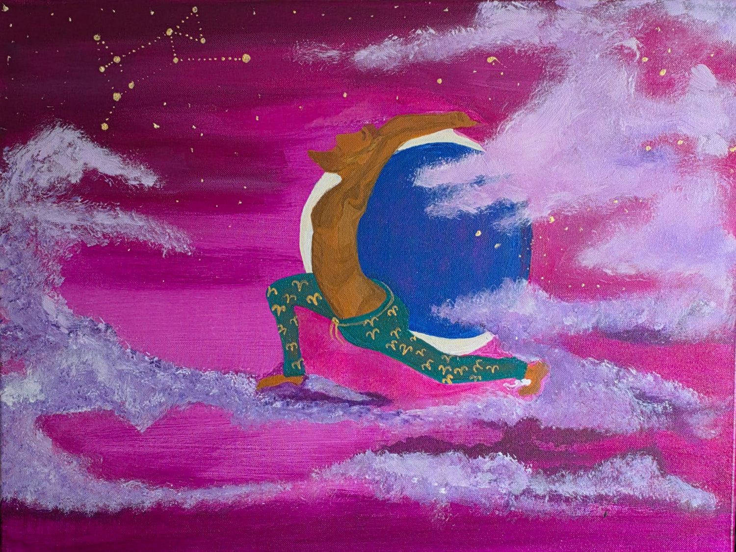 Man outstretched on clouds in sky mirroring the zodiac constellation of Aries.