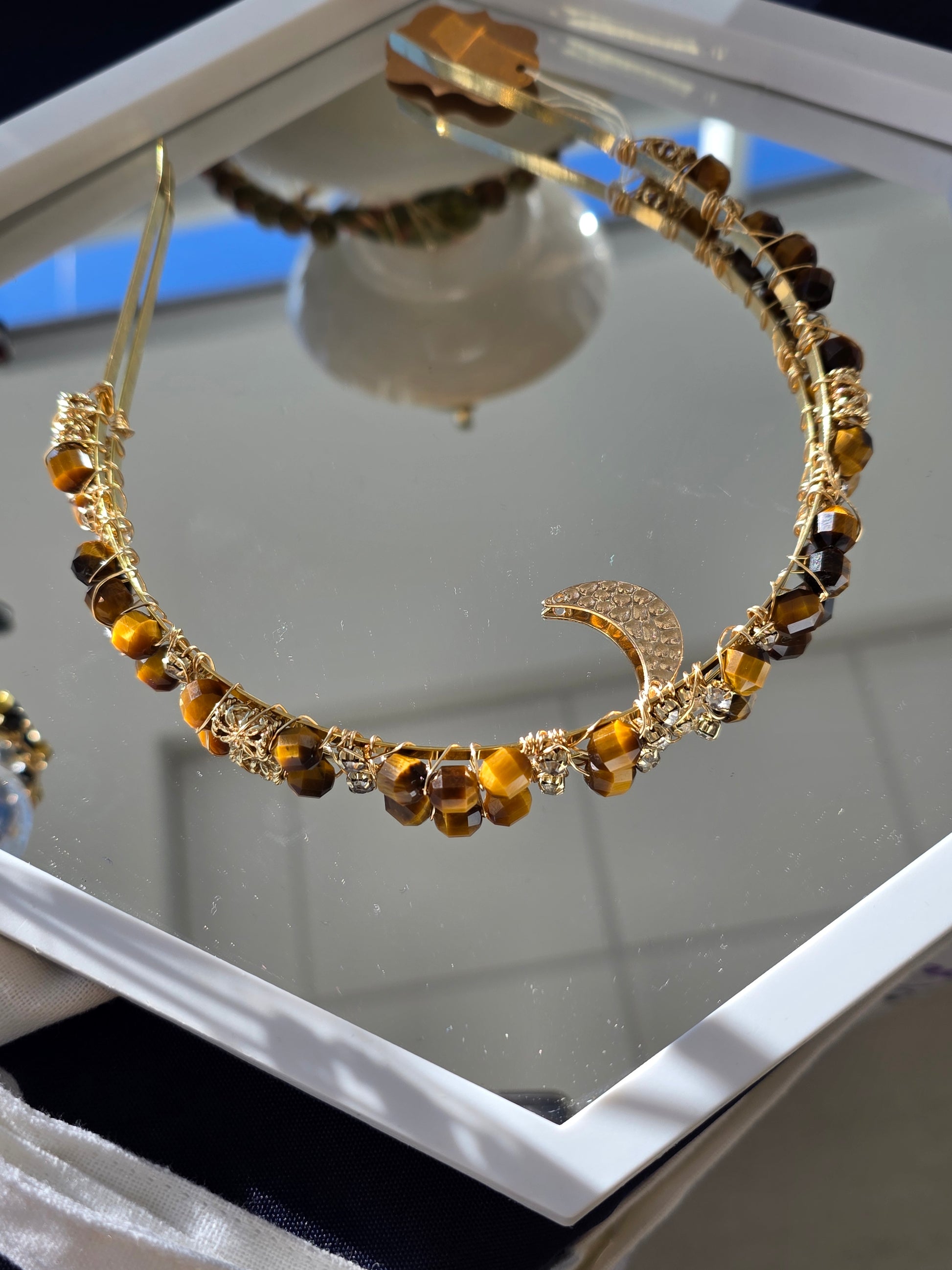 Unleash your inner strength and exude confidence with our Tiger's Eye Crown Couture! Featuring a stunning gold crescent moon and artisan-crafted tiger's eye stone, this one of a kind beaded headband will elevate any outfit. Embrace your unique style and stand out from the crowd with this bold hair accessory.
